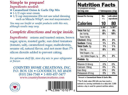 This mouthwatering dip mix combines sweetened caramelized onions with roasted garlic and is delicious with potato chips, pretzels and vegetables. It also tastes great served warm in a slow cooker.