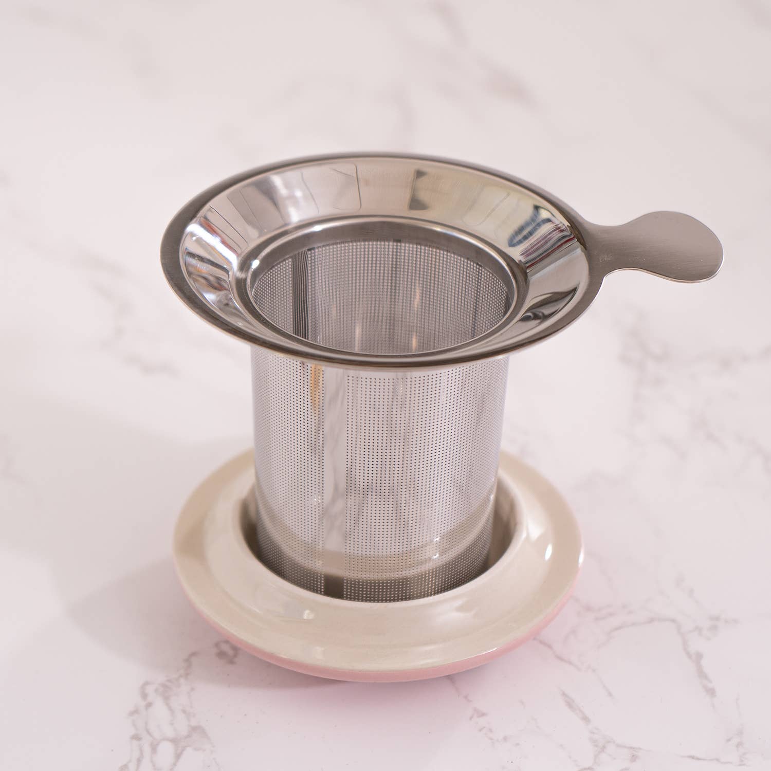 Material: Porcelain Mug and Lid, Stainless Steel Strainer