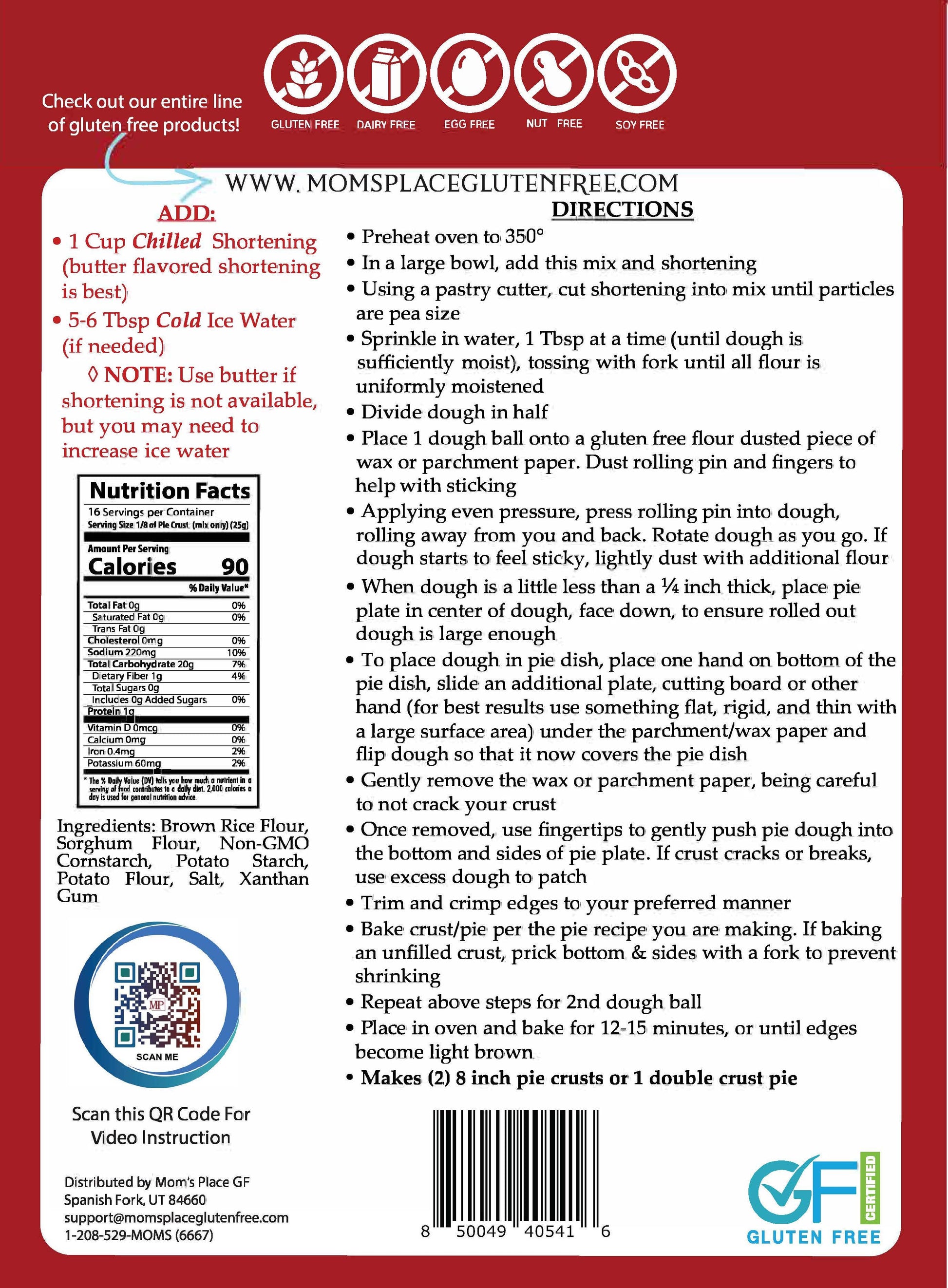 Embrace your inner baker with Mom's Place Gluten-Free Blue Ribbon Pie Crust Mix! Create homemade pies with a flaky crust just like grandma used to make. Our versatile mix is perfect for any favorite pie filling, making it a must-have for any kitchen and for any occasion! Their gluten-free Blue Ribbon Pie Crust mix will make (2) 8-9 inch pie crusts. Easy to make and even easier to enjoy! * SAFETY & QUALITY: Mom’s Place Gluten-Free owns and operates its own manufacturing facility located in Spanish Fork, Utah. They are a dedicated nut-free and gluten-free facility committed to providing the highest quality and best tasting food available. * GREAT TASTING: Mom’s Place Blue Ribbon Pie Crust Mix creates a perfectly flaky and tasty crust every time!