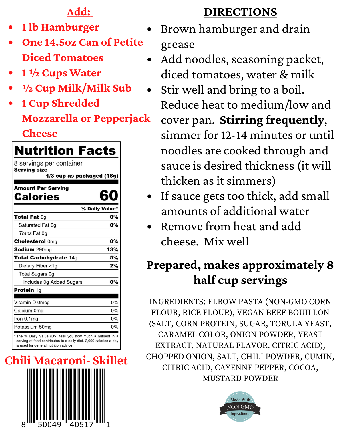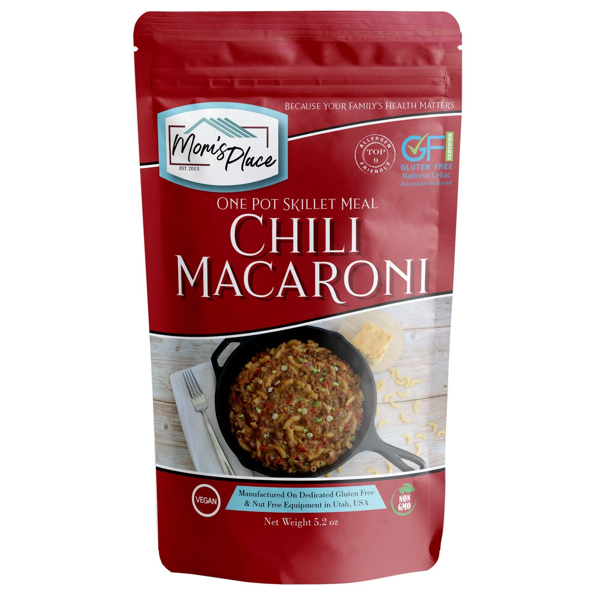 Need a quick easy meal that the entire family will love? Mom’s Place Gluten-Free Chili Macaroni Skillet Meal Mix is the perfect solution! We’ve combined the best gluten-free elbow pasta we could find (direct from Italy!) along with a blend of herbs and spices to create a delicious one-pot meal that the whole family will be asking for again and again. Just add ground beef and a few other ingredients and dinner is ready in no time! Serves 8.