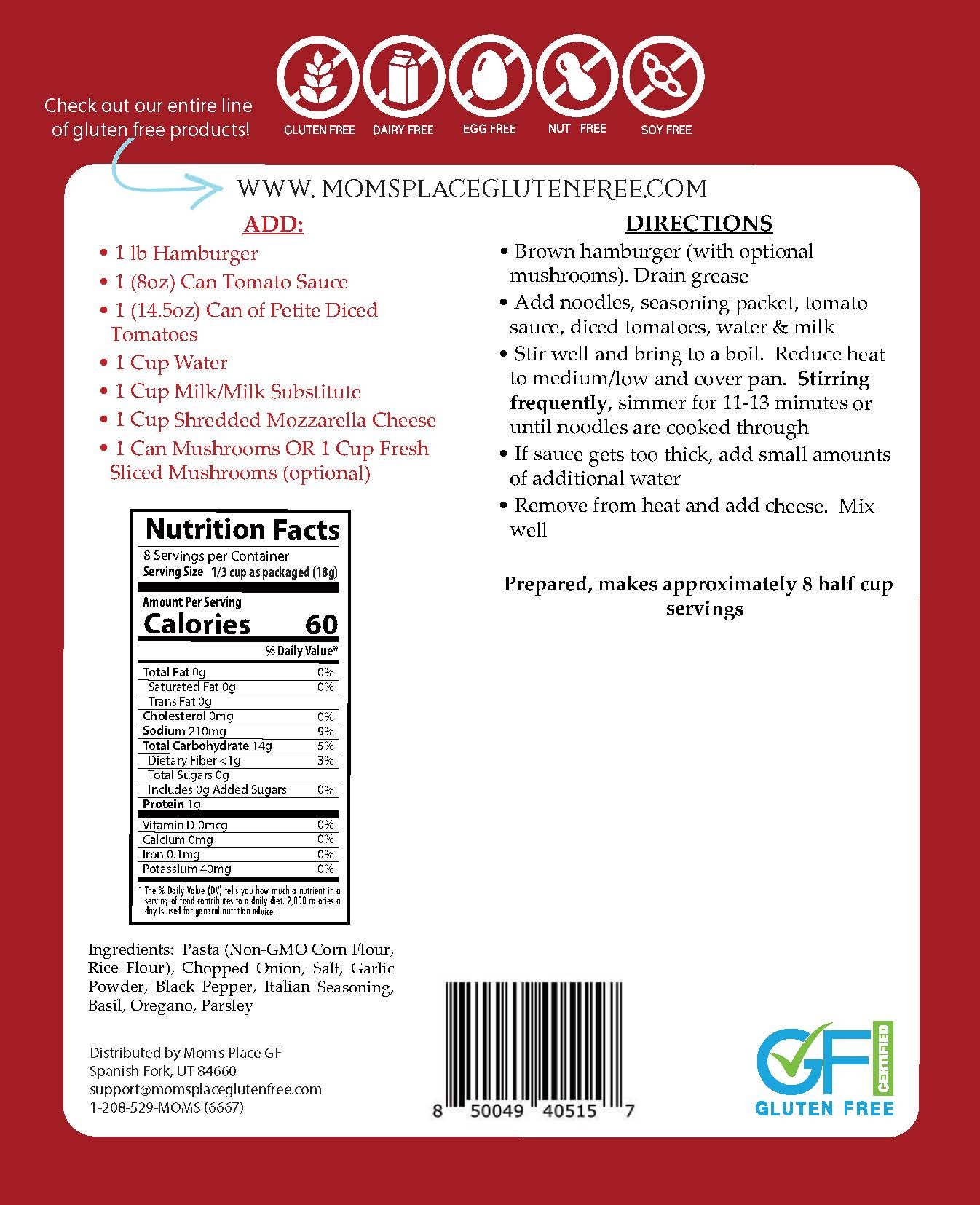 Mom's Place Gluten-Free Lasagne Skillet Meal is a one-pot Italian-style masterpiece! It's quick, easy and delicious. We've combined the best gluten-free mafalda pasta we could find (direct from Italy!), along with a blend of herbs and spices to create this delicious one-pot meal that the whole family will love. Just add ground beef and a few other ingredients and dinner is ready in no time! Makes 8 servings.