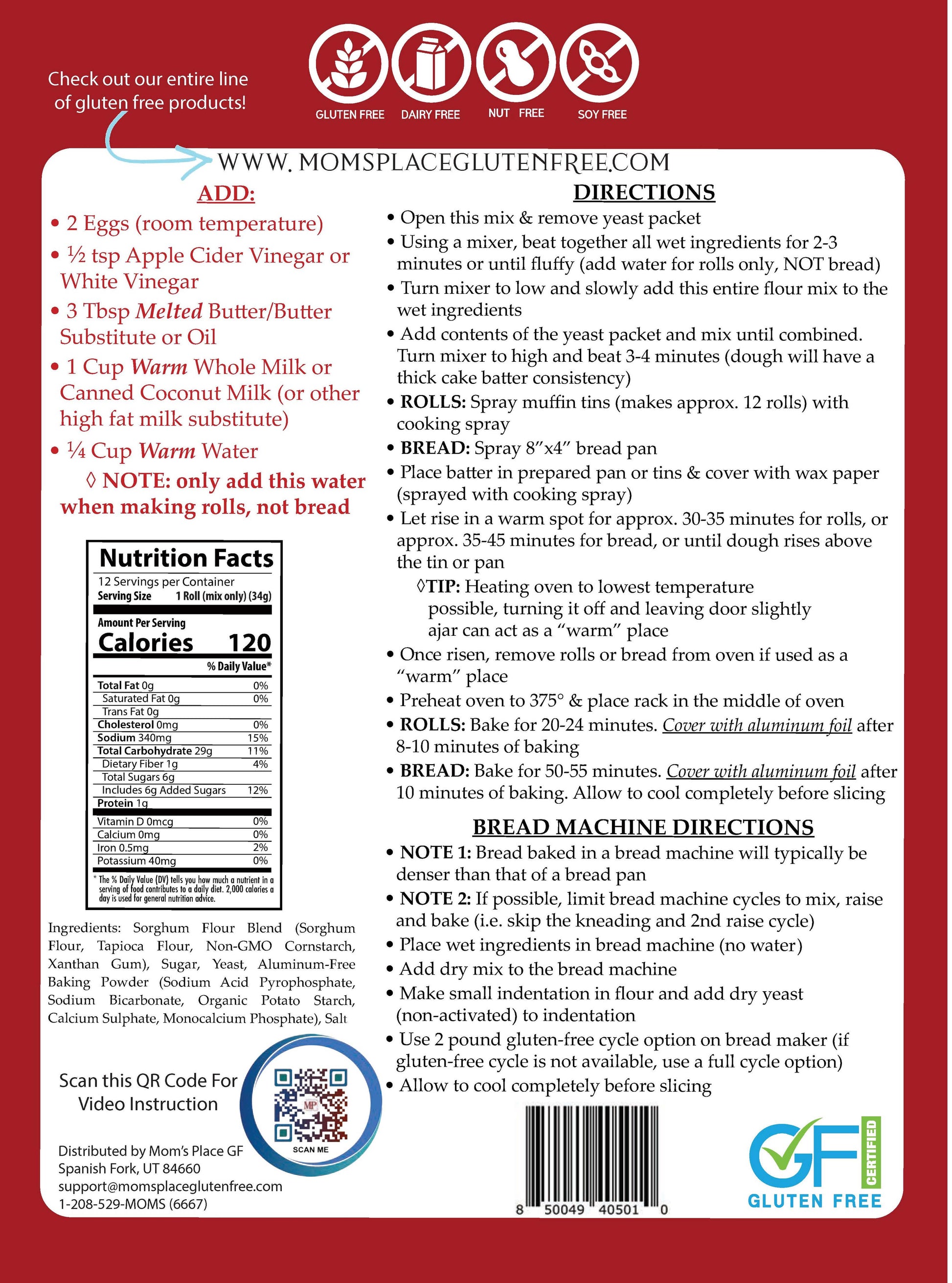 Whether you're hosting a brunch, a cozy dinner, or simply seeking a delicious gluten-free wheat bread alternative for sandwiches or meals, Mom's Place Gluten-Free "I Can't Believe These Aren't Wheat" Rolls or Bread Mix is your go-to option! Mom's Place creates ancient grain rolls/bread offer the delightful taste and texture of traditional wheat bread, but without the gluten. Their carefully selected gluten-free ingredients ensure that everyone, regardless of dietary restrictions, can enjoy the simple pleasure of biting into a perfectly baked gluten-free roll or slice of homemade bread. Our bread mix works well in both bread machines or loaf pans. Makes 12 rolls or 1 loaf of bread.