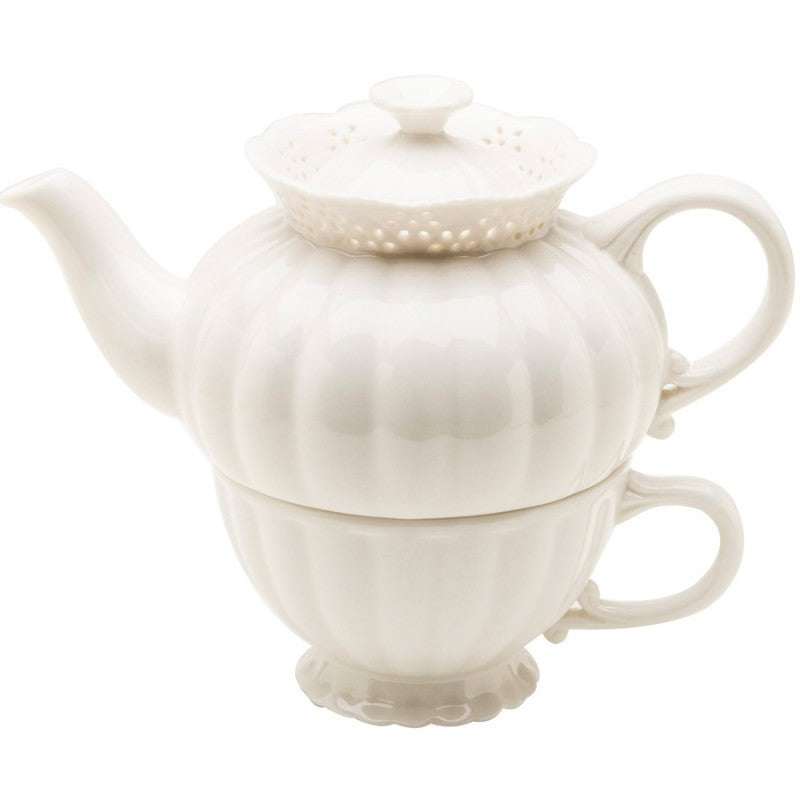 7.5 inch in Height. 3 Piece Includes Stacked Teapot/Lid with Cup. Plain White Openwork Porcelain. Cup holds 8-ounces