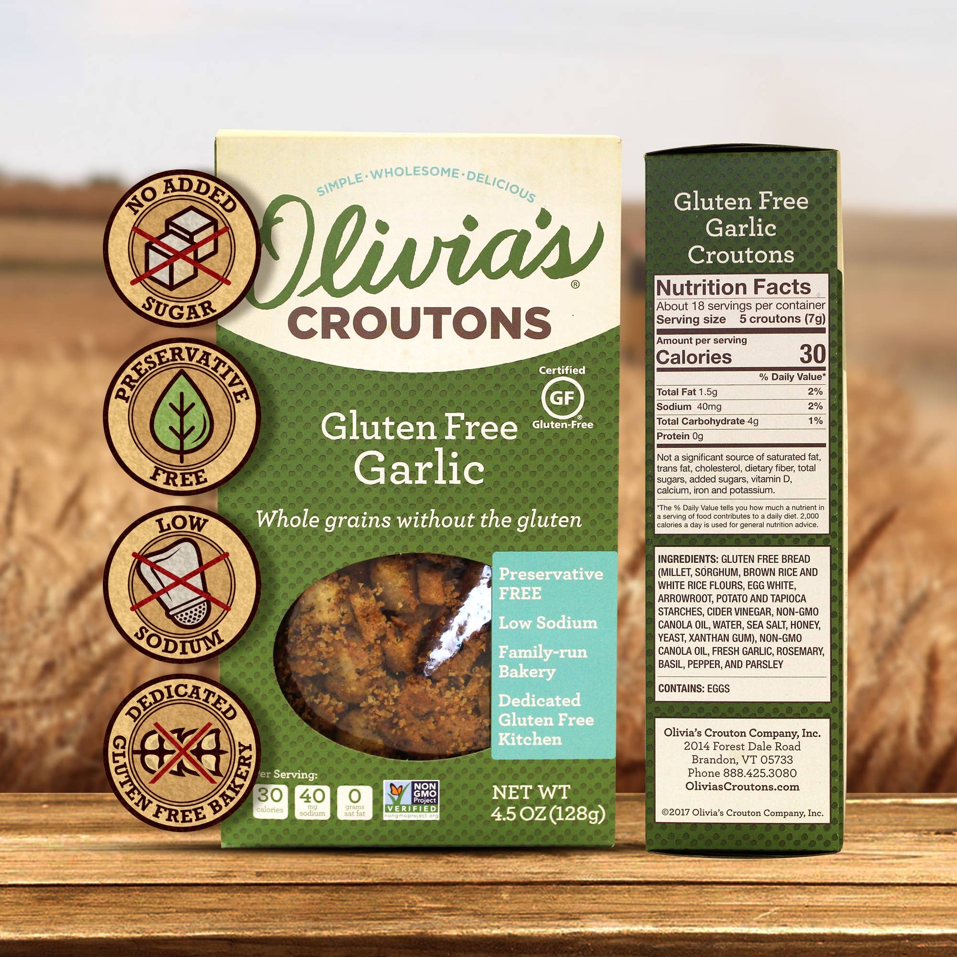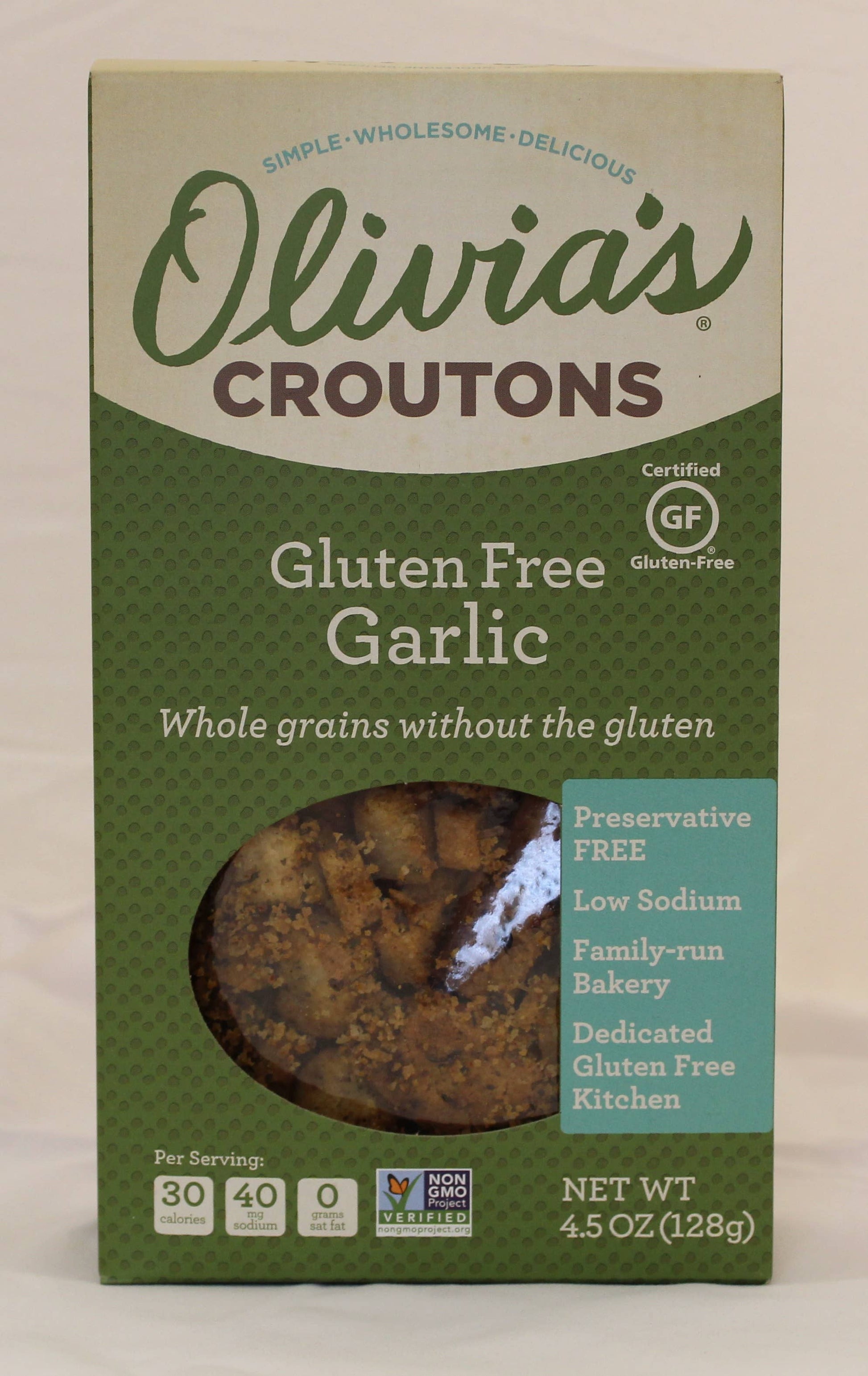 Olivia's certified Gluten Free Garlic croutons are made from our own multigrain gluten free bread. Not your typical gluten free flour blend. These croutons offer a more nutritious option than other GF croutons. Generously seasoned with fresh garlic, herbs and spices, they yield a delicious, extra crunchy crouton, to be enjoyed by anyone. Ready for your salad, soup, recipe, or straight out of the box.