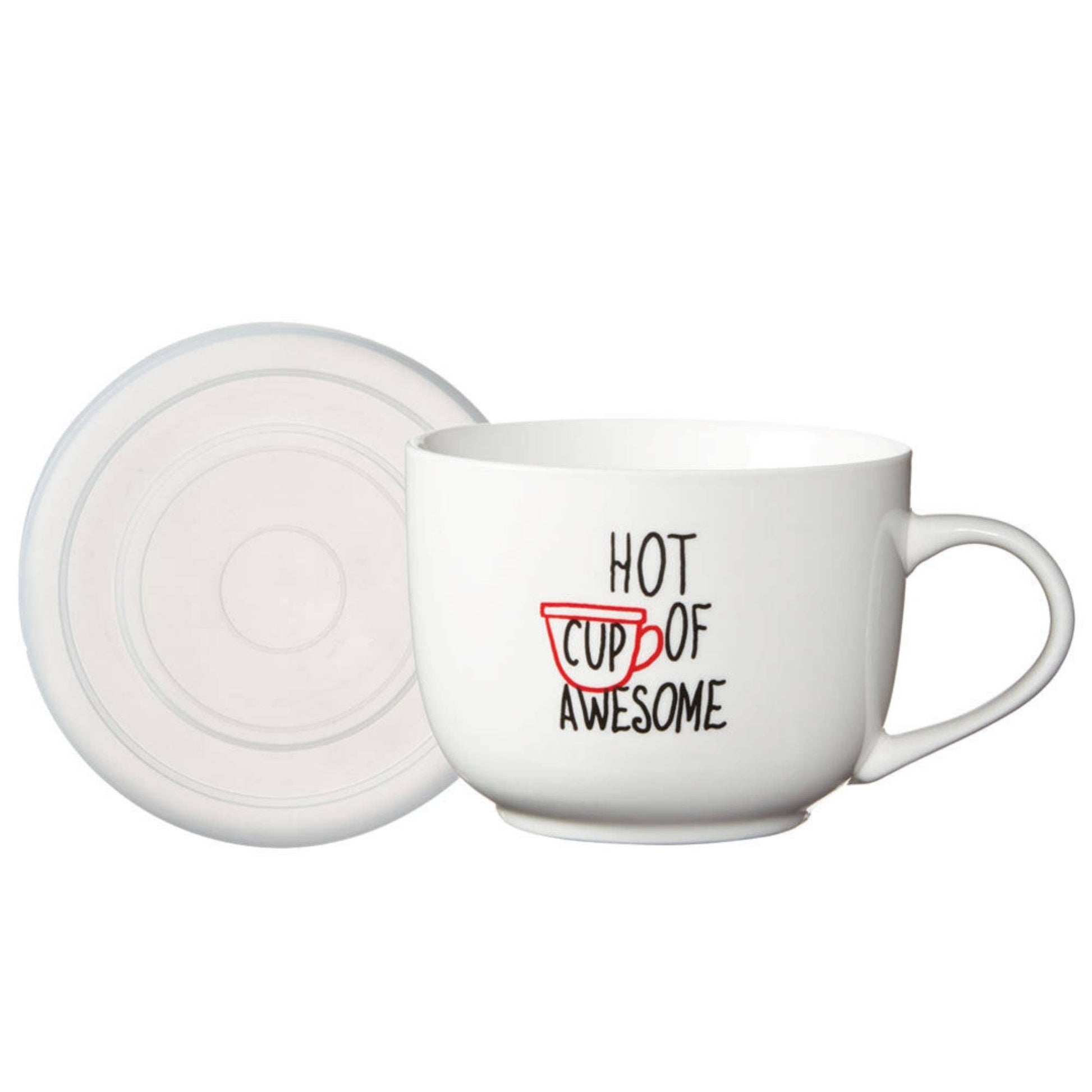 Soup mug or cool tea mug with a lid? You decide! Porcelain mug with whimsical saying 18-ounce mug Made with high quality porcelain Casual and stylish for everyday use Dishwasher and microwave safe.