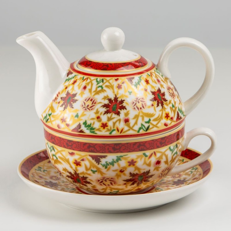 4 Piece Includes Teapot Stacked with Cup Saucer. Made of Porcelain. Cup holds 7-ounces